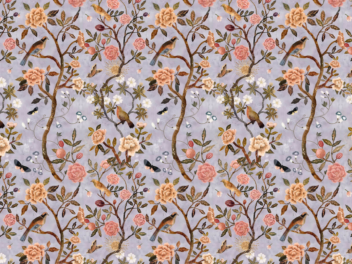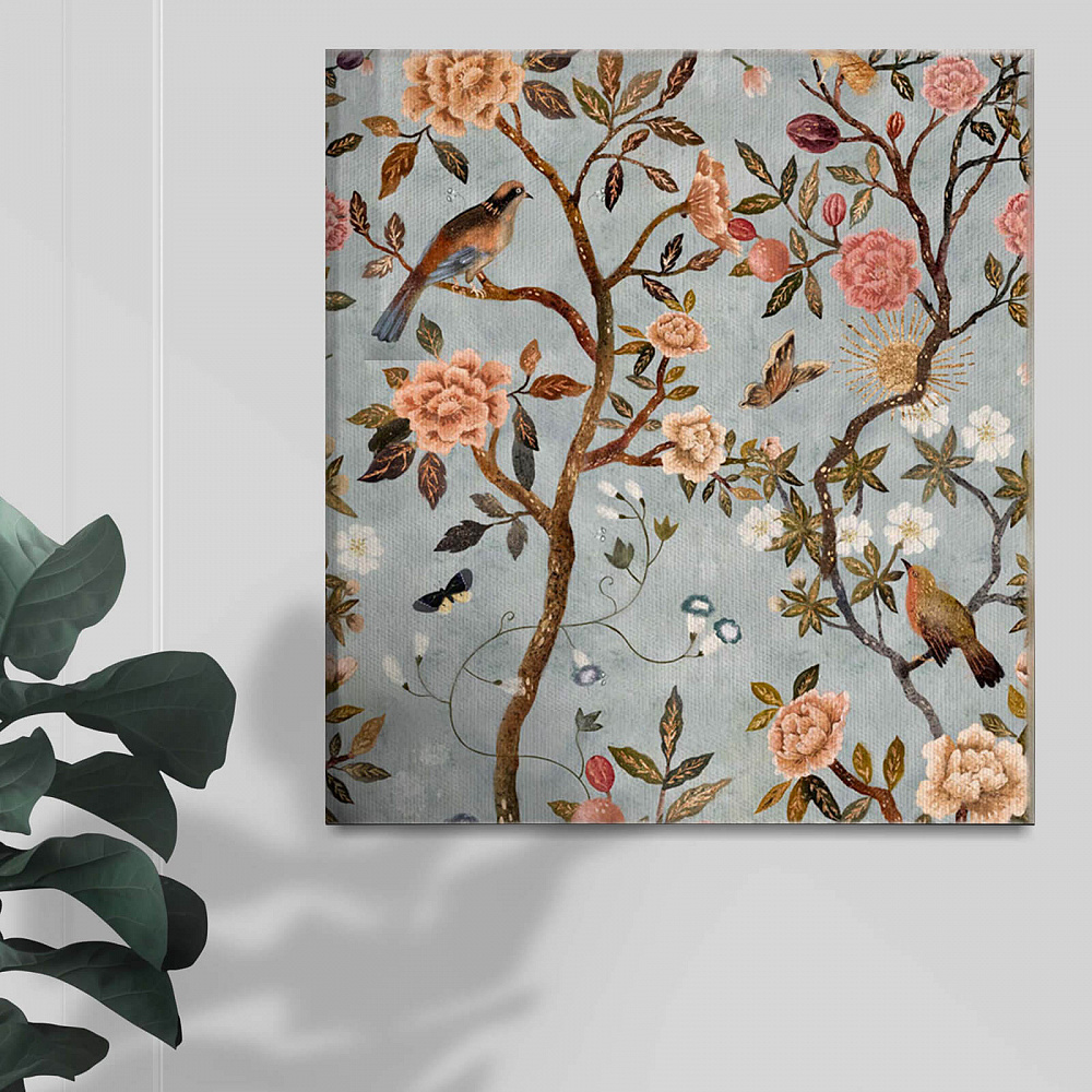 Нежные цветы распускаются на глазах, их лепестки трепещут, подчиняясь дыханию весны. Извивающиеся ветви простираются к солнцу, создавая утончённый ритм, а грациозные птицы застывают в невесомом мгновении - ещё секунда, и они воспарят ввысь. В этом изображении звучит шелест листьев, ощущается ласковое прикосновение ветра, витает аромат тёплой весны.