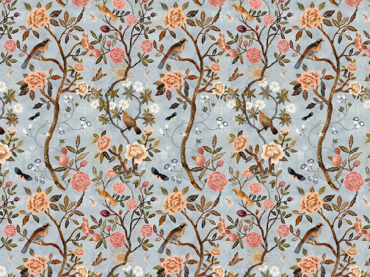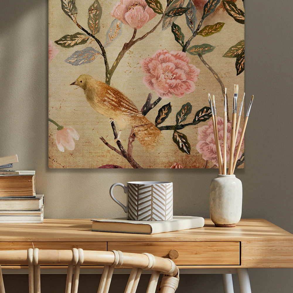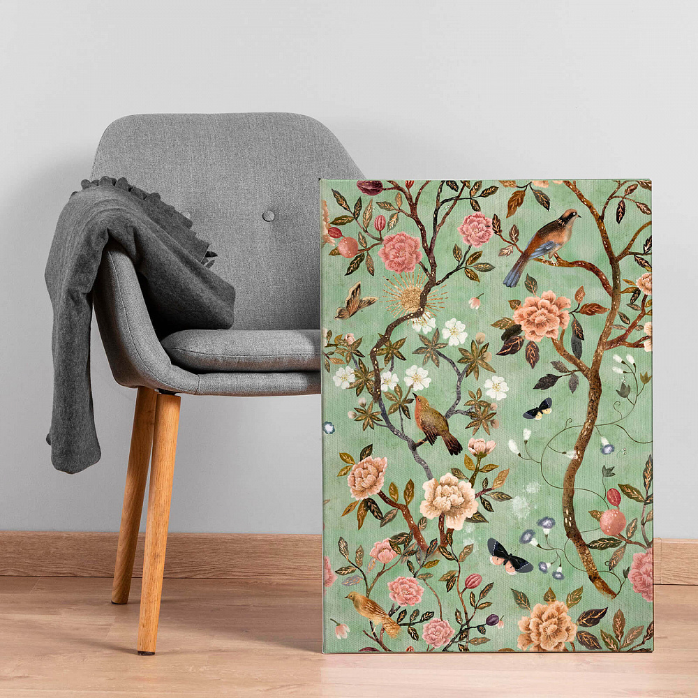 Нежные цветы распускаются на глазах, их лепестки трепещут, подчиняясь дыханию весны. Извивающиеся ветви простираются к солнцу, создавая утончённый ритм, а грациозные птицы застывают в невесомом мгновении - ещё секунда, и они воспарят ввысь. В этом изображении звучит шелест листьев, ощущается ласковое прикосновение ветра, витает аромат тёплой весны.